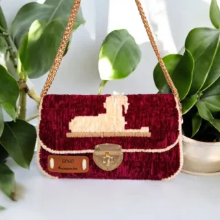 Bolso de mano de terciopelo con un diseño único. - Color burdeos con detalles en beige. - Adorno de un esfinge. - Cierre metálico dorado. - Correa dorada trenzada. - Etiqueta GOGO Accessories.
