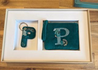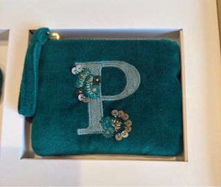 Conjunto de cartera y llavero con acabado de terciopelo. - Color verde esmeralda. - Detalle de inicial 'P' bordada. - Adornos de lentejuelas y abalorios.