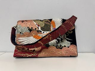 Elegante bolso de terciopelo con un intrincado bordado de inspiración oriental. Presenta un diseño detallado con motivos de aves y elementos naturales. - Material: Terciopelo. - Diseño: Bordado de grullas y motivos florales. - Estilo: Oriental.