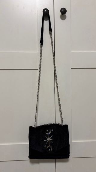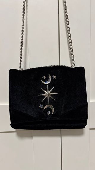 Bolso de terciopelo con un diseño celestial. - Adornado con apliques plateados de lunas y estrellas. - Cadena plateada para llevar al hombro o cruzado.