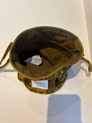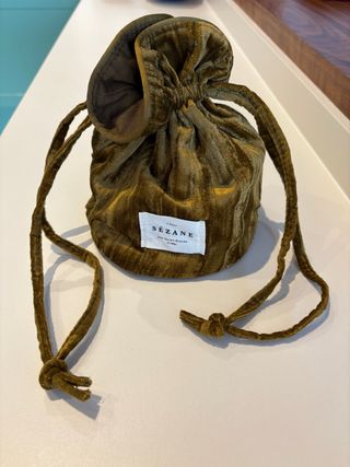Bolsito de mano de terciopelo de Sézane en color dorado. La base, que es un círculo, mide 13cm de diámetro. De alto mide 19cm.