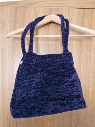 Bolso de terciopelo con un tacto muy suave y agradable. Su color morado intenso lo hace destacar. - Material: Terciopelo. - Diseño: Bolso de mano con asas. - Textura: Acolchada y mullida.
