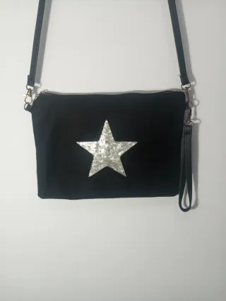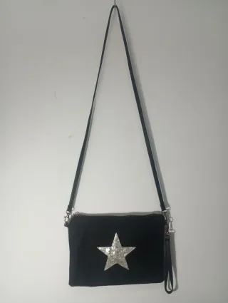 Bolso de terciopelo con un diseño urbano y muy práctico. - Adorno de estrella plateada. - Cierre de cremallera. - Incluye correa de mano y correa larga. - Material: Terciopelo.