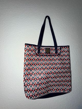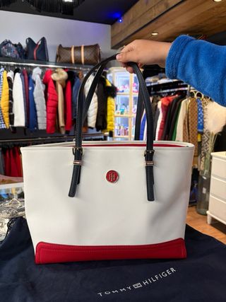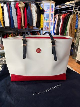 Elegante bolso tote de la marca Tommy Hilfiger. Este bolso me lo regalaron, no llegue a usarlo nunca. - Diseño tricolor en blanco con detalles en rojo y azul marino - Asa de mano con detalles metálicos. - Logo de la marca en la parte frontal.