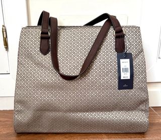 Bolso shopping con un diseño llamativo y elegante. - Estampado monograma. - Detalles de rayas en rojo, blanco y azul. - Asas de cuero marrón. - Compartimento principal con cremallera. -Abertura secreta delantera ideal para el movil o las llaves. -Si te interesa también puedo pasar un video para que se aprecie mejor.