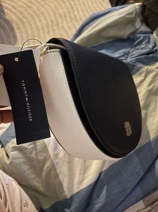 Bolso de la marca Tommy Hilfiger con un diseño bicolor. - Combinación de azul marino y blanco. - Detalle metálico dorado con logo. - Cierre de solapa.