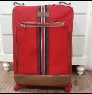 Maleta de viaje de la marca Tommy Hilfiger. - Diseño con detalles de rayas en azul, blanco y negro. - Acabado en color rojo. - Ribetes y detalles en piel sintética color marrón.