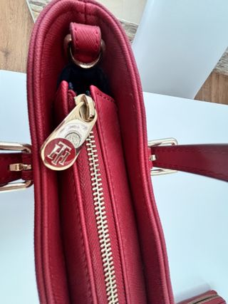 Conjunto de bolso tote y cartera a juego. Precioso bolso tote de Tommy Hilfiger en color rojo (rojo burdeos / rojo vino elegante), muy versátil. Perfecto para el día a día o para darle un toque sofisticado a cualquier look. Estado: Está prácticamente nuevo, usado solo una vez. Se conserva impecable. Medidas del bolso: Largo: 25 cm Alto: 18 cm Ancho: 9 cm ✔️ Incluye correa larga desmontable para llevarlo cómodamente al hombro o cruzado. ✔️ Diseño estructurado que mantiene la forma. ✔️ Detalles metálicos dorados y logo frontal que le dan un toque muy elegante. 🎁 REGALO: Incluyo cartera Tommy Hilfiger a juego. Tiene algo más de