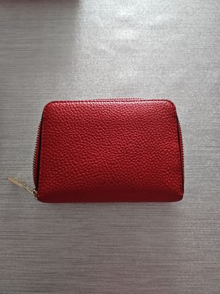 Cartera con billetera, monedero y tarjetero de piel en buen estado. En un lado tiene 12 compartimentos para tarjetas, uno transparente para fotos o DNI y 2 bolsillos grandes para billetes o documentos. En el otro lado tiene otros 4 compartimentos y unos central con cremallera.