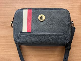 Preciosa bandolera Tommy Hilfiger, en azul marino y negro. Es un bolso pequeño, ideal para llevar lo esencial. - Tiene un compartimento principal con cierre de cremallera. - Asa larga regulable y extraíble para llevarlo al hombro o cruzado. - El exterior presenta un ligero desgaste.