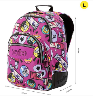 Mochila Totto con un divertido estampado. - Diseño multicolor con detalles de personajes. - Compartimento principal espacioso. - Bolsillo frontal con cremallera. - Tirantes acolchados para mayor comodidad. Dimensiones: 33 x 44 x 13.5 Capacidad (L): 19.60 Peso (Kg): 0.91 Material: Exterior: poliéster reciclado=100%, Forro: poliéster reciclado=100%