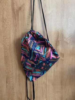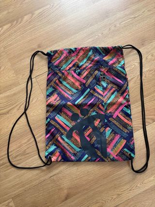 Mochila saco con un diseño vibrante y llamativo. - Cierre de cordones. - Bolsillo exterior con cremallera. - Estampado abstracto con líneas en varios colores. Pago en efectivo a la entrega.