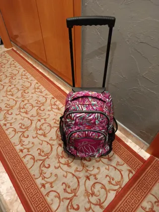 Mochila Totto con un diseño juvenil y práctico, ideal para llevar todo lo necesario. - Color morado con detalles en rosa. - Ruedas para facilitar el transporte. - Asa extensible.