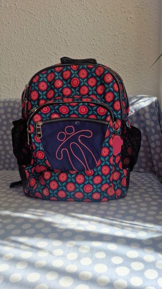 Mochila escolar en tonos rosas y rojos, ideal para el colegio. Es una mochila usada pero en buen estado. - Diseño floral - Compartimento principal con cremallera - Bolsillos laterales de rejilla - Asa superior para llevarla con la mano