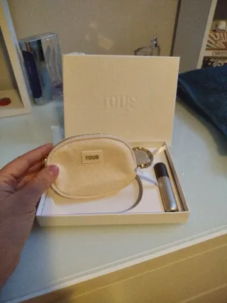 Estuche de la marca Tous. - Color beige con detalles dorados. - Incluye monedero para monedas, cuelga bolso,aplicador de perfume para bolso.