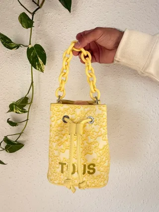 Marca: TOUS Artículo: bolso tipo saco / bucket bag Color: beige crema con detalles del oso en amarillo Asa: cadena amarilla Cierre: cordón ajustable (drawstring) Diseño moderno y actual Elegante y original, fácil de combinar Ideal para uso diario Hashtags - Asa de cadena. - Cierre de cordón. - Estampado distintivo de la marca.