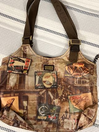 Bolso Tous con un diseño estampado que evoca imágenes vintage y artículos de época. - Estampado con motivos de relojes y anuncios antiguos. - Correa de hombro ajustable. - Cierre de cremallera.