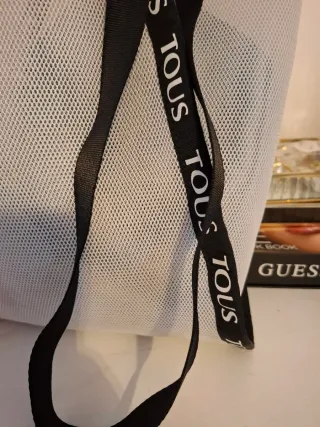 Bolso de la marca Tous con un diseño moderno y práctico. - Material de malla blanco. - Asas y ribetes en color negro. - Logo de la marca repetido en las asas y el borde.con alguna manchas