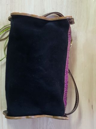 Bolso de la marca Tous con un diseño llamativo. - Acabado efecto piel de cocodrilo. - Combinación de colores marrón y morado. - Detalle de osito. - Adorno de flecos verdes.