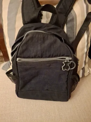 Mochila pequeña de la marca Tous. - Color negro. - Diseño con múltiples compartimentos y bolsillos. - Incluye un charm de oso característico de la marca.