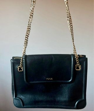 Bolso de mano o de hombro de la marca Tous, en piel negra y con cadena dorada. - Cierre con solapa. - Pequeña mancha interior, ver foto. - Detalle de osito Tous en la cadena. - Medidas aprox.: 28×20×8 cm. -Interior amplio con compartimentos.