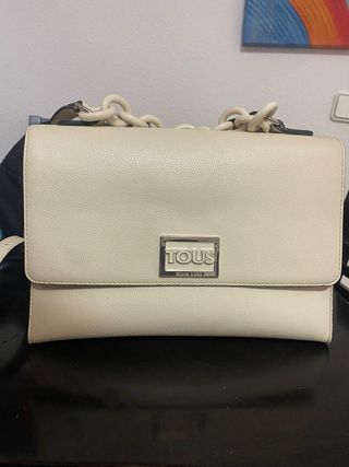 Bolso Tous en color beige. Presenta un diseño elegante con detalles de cadena. PRODUCTO ORIGINAL Tiene unos pequeños desperfectos en los lados por donde se dobla en bolsa para cerrarlo. (Se aprecia a los laterales en las fotos 6 y 7) - Cierre de solapa. - Placa metálica con el logo de la marca. - Asa ajustable.
