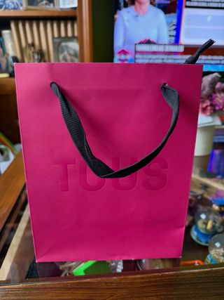Bolsa de la marca Tous en color rosa. - Asa de cinta negra. - Logo de la marca en relieve. 21x26x12