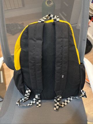 Mochila de la marca Vans con un diseño llamativo. - Combinación de colores negro y amarillo. - Estampado de cuadros en la parte inferior. - Logo de Vans en la parte frontal.