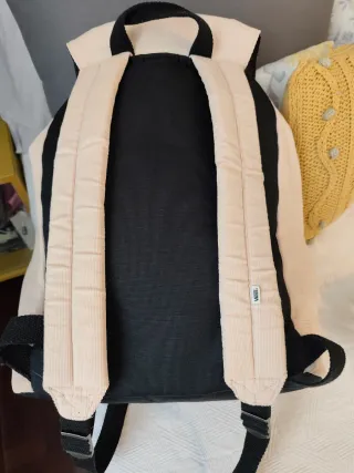 Mochila Vans de pana en color rosa pálido. Tiene un diseño moderno y práctico. Bolsillo interior para ordenador, forro impermeable - Cierre principal con solapa y hebilla. - Dos bolsillos frontales con cremallera. - Asa superior y correas ajustables. - Pequeño logo de Vans en uno de los bolsillos.