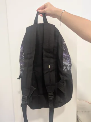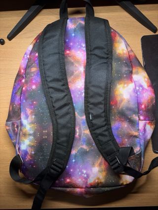 Mochila con un diseño de galaxia. Perfecta para llevar tus objetos. Es espaciosa y resistente - Estampado de nebulosa y estrellas. - Compartimento principal espacioso. - Dos bolsillos frontales con cremallera.