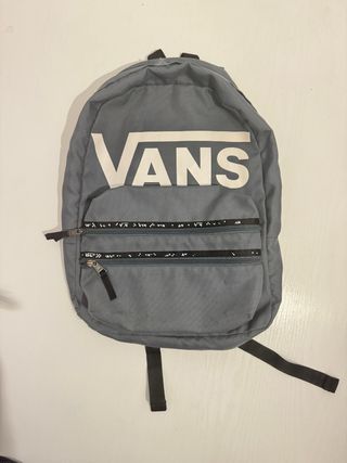 Mochila de la marca Vans en color gris. Cuenta con el logo de la marca en grande en la parte frontal, espaciosa tanto el bolsillo delantero con el principal.