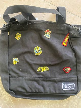Bolso tote de la marca Vans, modelo Elijah Berle. Un accesorio práctico y con estilo. - Diseño en color negro. - Tres parches decorativos. - Cierre de cremallera superior.