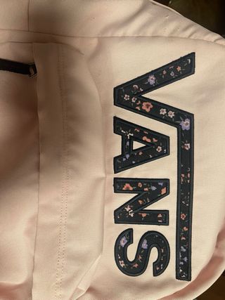 Mochila de la marca Vans con un diseño floral sobre fondo rosa. - Logo de Vans con detalle floral. - Tirantes ajustables.