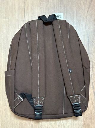 Mochila de la marca Vans en color marrón. Presenta un diseño clásico con un bolsillo frontal. - Parche con el logo de Vans Off The Wall en la parte superior. - Costuras decorativas en contraste.