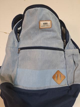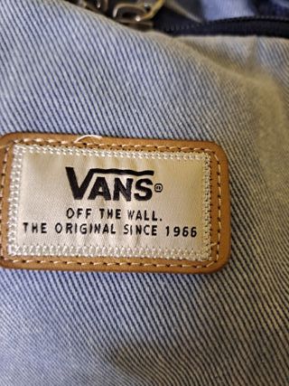 Preciosa mochila Vans auténtica con diseño único de tela vaquera, en colores azules denim y azul oscuro. Bolsillo central interior y también exterior con cierre de cremallera. También bolsillos exteriores laterales. Mide aproximadamente: 53 cm de alto y 42 cm de ancho. Composición: exterior 100% algodón, interior: 100% poliéster. Excelente estado, como nueva, apenas sin usar.
