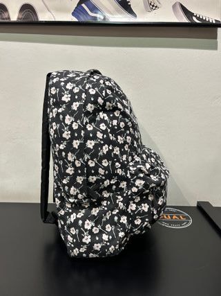 Mochila con estampado floral sobre fondo negro. Presenta el logo de Vans en la parte frontal. - Diseño con flores pequeñas en tonos rosas y blancos. - Cierre de cremallera principal. - Bolsillo frontal adicional.