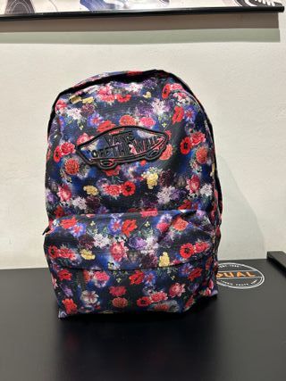 Mochila de la marca Vans con un llamativo estampado floral. - Diseño con flores en tonos morados, rojos y amarillos. - Parche de la marca Vans Off The Wall en la parte frontal.
