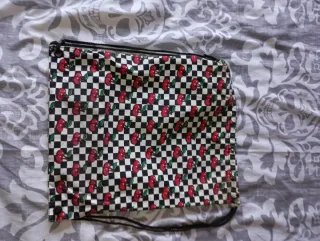 Mochila saco con un divertido estampado de tablero de ajedrez y cerezas rojas. - Diseño checkerboard con cerezas. - Cierre con cordones negros. - Ideal para llevar tus pertenencias.