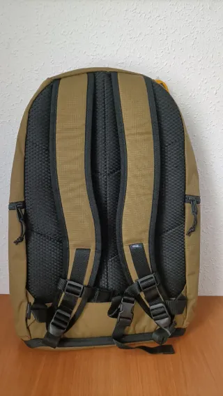 No negocio precio ni hago envios, entrego en mano en Laredo y Avilés. Mochila de la marca Vans en color verde oliva. Diseño moderno y funcional. - Compartimento principal espacioso 33 litros capacidad, con compartimento acolchado para portátil. - Bolsillo frontal con cremallera. - Correas ajustables para mayor comodidad. - Logo de Vans visible. - Cierre con solapa y correa con hebilla. =Dos bolsillos laterales para botella de agua. =Panel trasero con malla reticular.