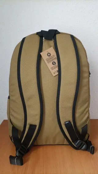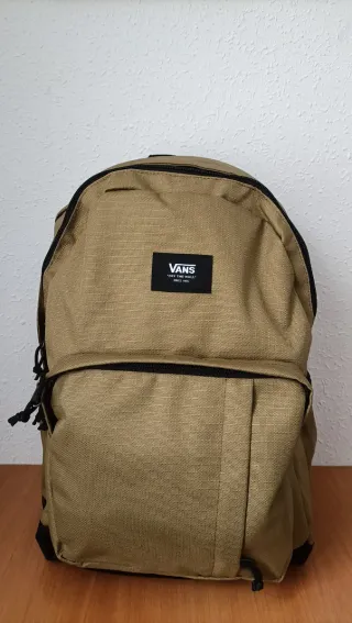 Puedo entregar en mano en Avilés y Laredo. Mochila Vans en color beige con detalles en negro. Es un artículo nuevo. - Compartimento principal espacioso. - Bolsillo frontal con cremallera. - Correas ajustables para mayor comodidad. - Tiene dos compartimentos centrales separados de gran capacidad. - Bolsillo lateral para botella de agua. - Gran capacidad 30 litros.