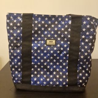 Bolsa de playa VANS, ideal para llevar a la playa o piscina, con zona isotérmica para llevar bebidas o comida y que se mantengan frias. Está sin usar. - Diseño con estrellas sobre fondo azul y blanco. - Asas resistentes para un transporte cómodo. Medidas 39 alto 45 ancho 20 fondo Tiene mucha capacidad, la mitad es la parte para llevar bebidas o alimentos y que se conserven fríos, se pueden meter bloques congelados para usarla en modo nevera, y tiene además un bolsillo interior para cosas pequeñas.