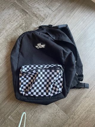 Mochila Vans en perfecto estado. - Compartimento principal amplio. - Bolsillo frontal con diseño de cuadros blancos y negros. - Correas ajustables para mayor comodidad. Medidas: 41 (alto) x 30,4 (ancho) x 12 (fondo) cm.