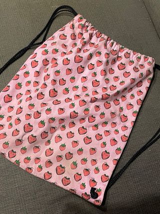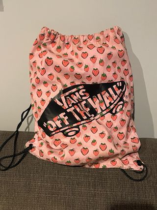 Mochila de tela con un divertido estampado de fresas sobre fondo rosa. - Cierre de cordón. - Marca Vans. - Material: Tela.