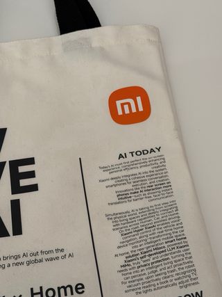 Bolso de tela con diseño The New Wave of AI de Xiaomi. Perfecto para llevar tus pertenencias. - Diseño gráfico The New Wave of AI. - Logo de Xiaomi. - Asas negras.