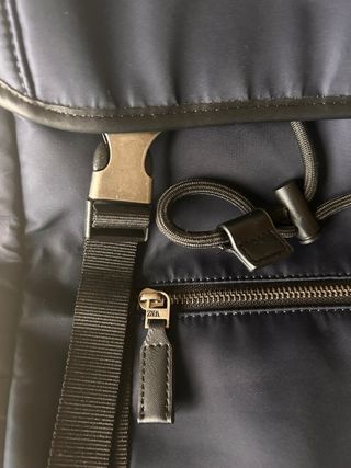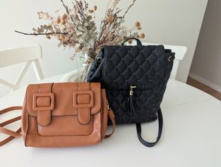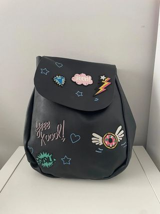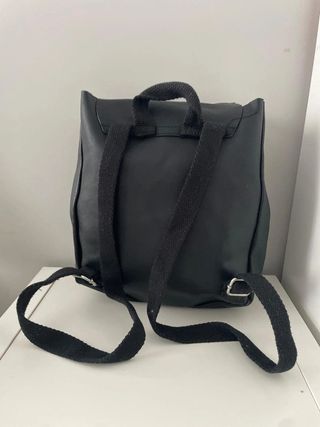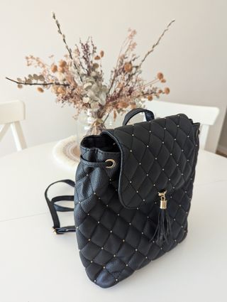Mochila de polipiel, color negro mate con decoraciones doradas. Varios compartimentos interiores. Cómo puede verse en las fotos está completamente nueva, ningún uso. REGALO el bolso color camel ya que tiene un defecto en el asa, aunque puede seguir usándose una buena temporada. Bolso, mochila, bandolera, tote bag, bolsa, Zara