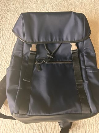 Mochila de estilo casual y moderno. - Cierre de cordón. - Asa superior. - Bolsillo frontal. Pequeños signos de uso en la base de las tiras y el cordón de cierre del bolsillo principal. No apreciables con ella puesta.