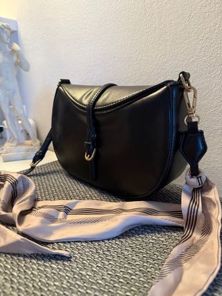Elegante bolso de mano Zara en color negro. Cuenta con un diseño moderno y un pañuelo decorativo atado a una de las asas. La bolsa tiene dos correas. - Cierre con solapa y hebilla. - Asa larga ajustable. - Pañuelo estampado con líneas.
