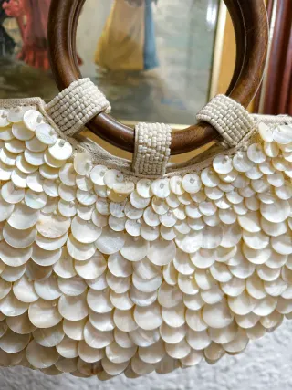 Bolso de mano con un diseño único y veraniego. Perfecto para darle un toque especial a tus looks. - Adornado con conchas marinas. - Asa de madera. - Tejido principal de tela con detalles de cuentas.