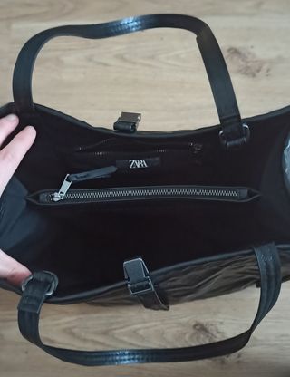 Bolso negro de Zara. Esta nuevo. Comprado y sin opción de devolución. Descripción de la tienda: Bolso formato shopper efecto arrugado. Forro interior. Compartimento y bolsillo interior con cremallera. Asas de hombro. Alto x Ancho x Fondo: 32 x 35 x 14 cm.