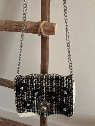 Elegante bolso de Zara con un diseño moderno. - Tejido tweed en blanco y negro. - Adornos florales negros y perlas. - Cadena plateada. - Cierre metálico.